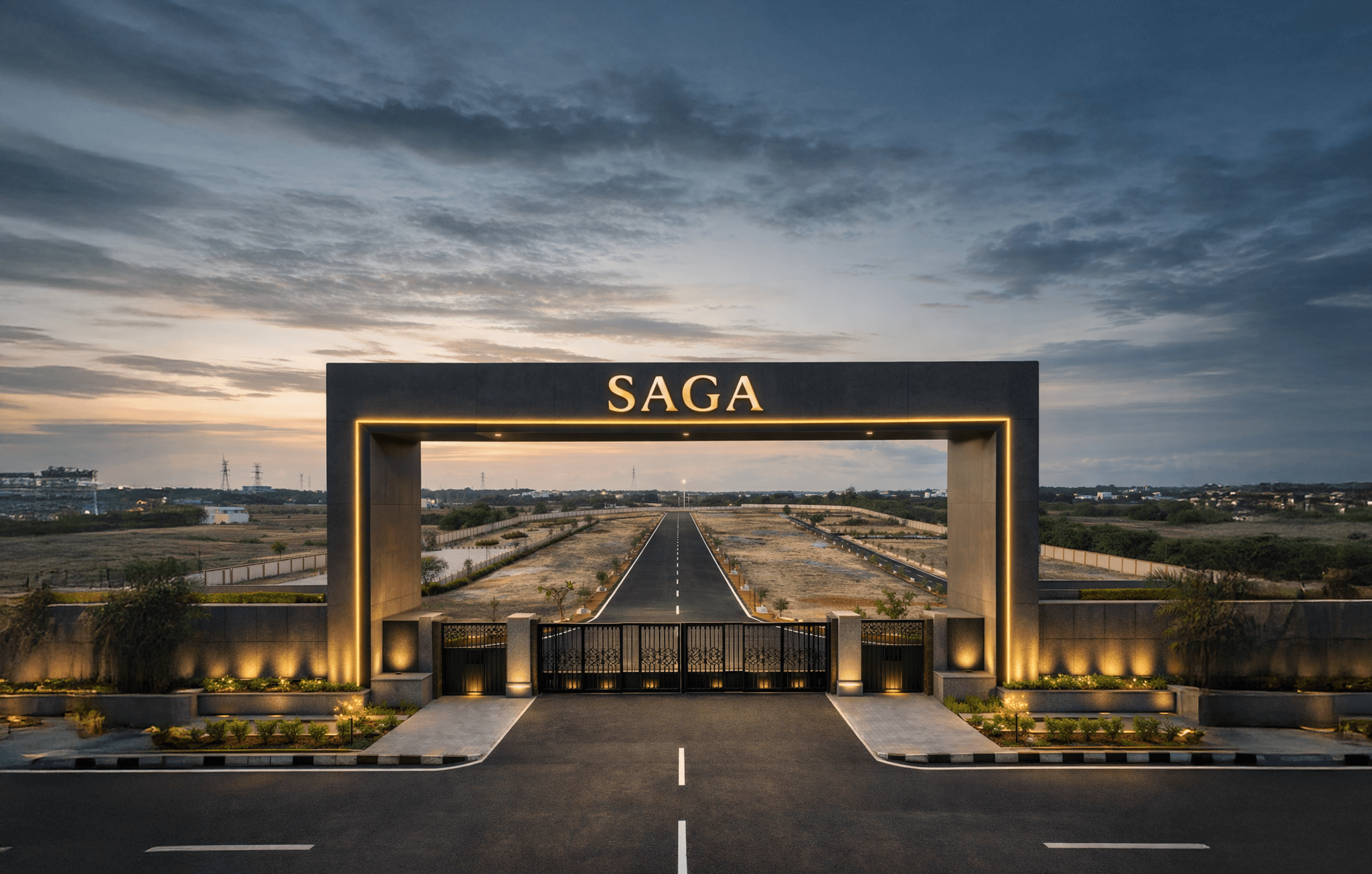 SAGA is a well-planned gated community featuring landscaped green zones, a central green hub, children’s play area, premium blacktop roads, street lighting, assured water supply, storm-water drainage, and 24/7 safety infrastructure.
